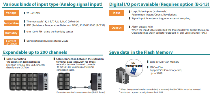 GLT400 无线数据记录仪多可扩展至200ch,可以增加传感器进行电压/温度/湿度/脉冲/逻辑的多元输入。GLT400 记录仪适用于通道数多的温度测定;而耐高电压型GLT400 记录仪适用于积层电池包的电压测定和高精度的温度测定。