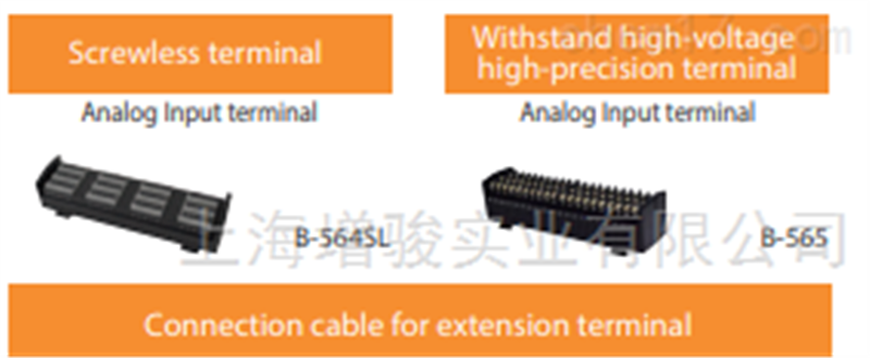 为输入模拟信号、准备了标准输入端子台 (B-564)和高耐压高精度端子台 (B-565)、供不同测量用途选择使用。两端子台采用了全通道隔离输入方式、可测量各种各样的现象。标准通道数为20ch、最大可扩展至200ch、使用接续线缆·扩展基座·端子台可延长本体-端子间距至20m。