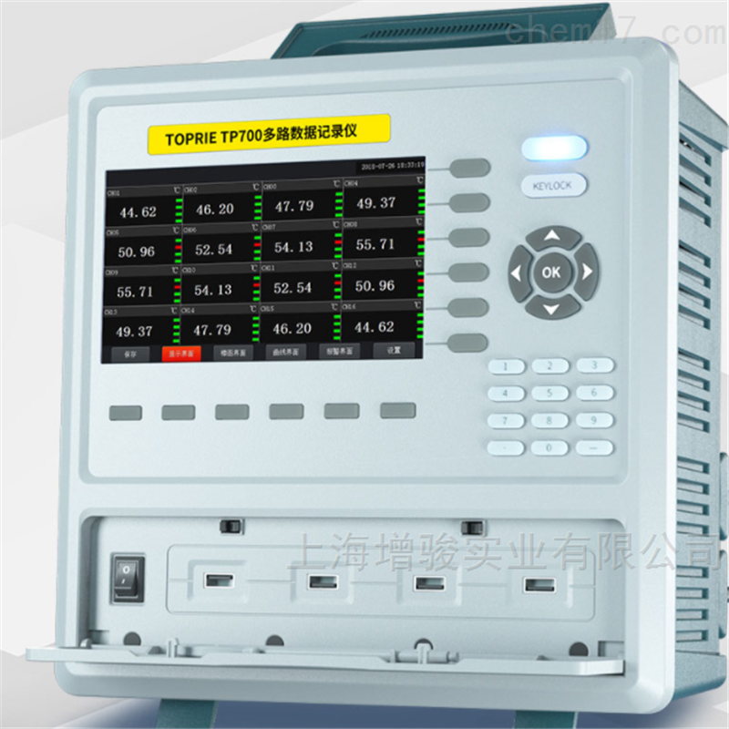 TP700无纸记录仪支持温度、湿度、电流、电压、压力、液位、流量、位移等同时测试,采用简约外观设计,轻便易用,可无线远传至电脑IE&手机微信监控. 7英寸触摸显示屏,8-64通道(可外接模块拓展至200通道),内存3G ,热电偶和热电阻连接测试温度,4-20mA/0-20mA 0-5V/O-10V ,采集0.1S /1S数据。