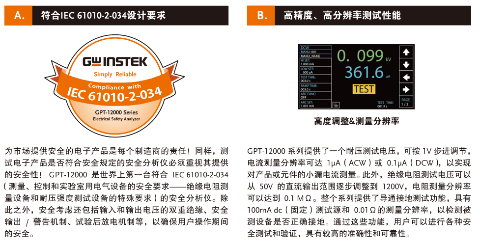 GW Instek推出GPT-12000系列旗舰型电气安全分析仪(200VA输出容量),符合IEC 61010-2-034的安规测试仪(测量,控制和电气需求的安全要求)实验室使用特殊要求测量设备的绝缘电阻和测试设备的电气强度,控制和实验室使用对绝缘电阻测量设备和电气强度测试设备的特殊要求)),规定了软体的要求和在设计高压和绝缘电阻测试,测量仪器时必须遵循硬体介面,以确保在使用仪器时为用户提供必要的保护和警告。