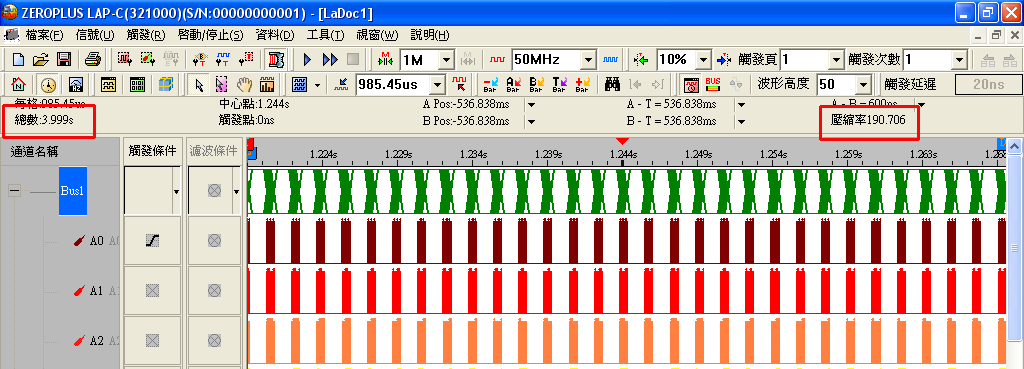孕龙科技推出波行压缩zhuan利技术,可以在不增加内存的状况下获取更长的波形资料。For Example:设定内存深度为1M,取样率为50MHz。未开启压缩功能时仅可撷取20.972ms,若开启压缩功能后,以同样记忆深度为1M,取样率为50MHz进行取样,则可以将波形时间增加至3.999s,大大的提升了撷取数据量。 |
