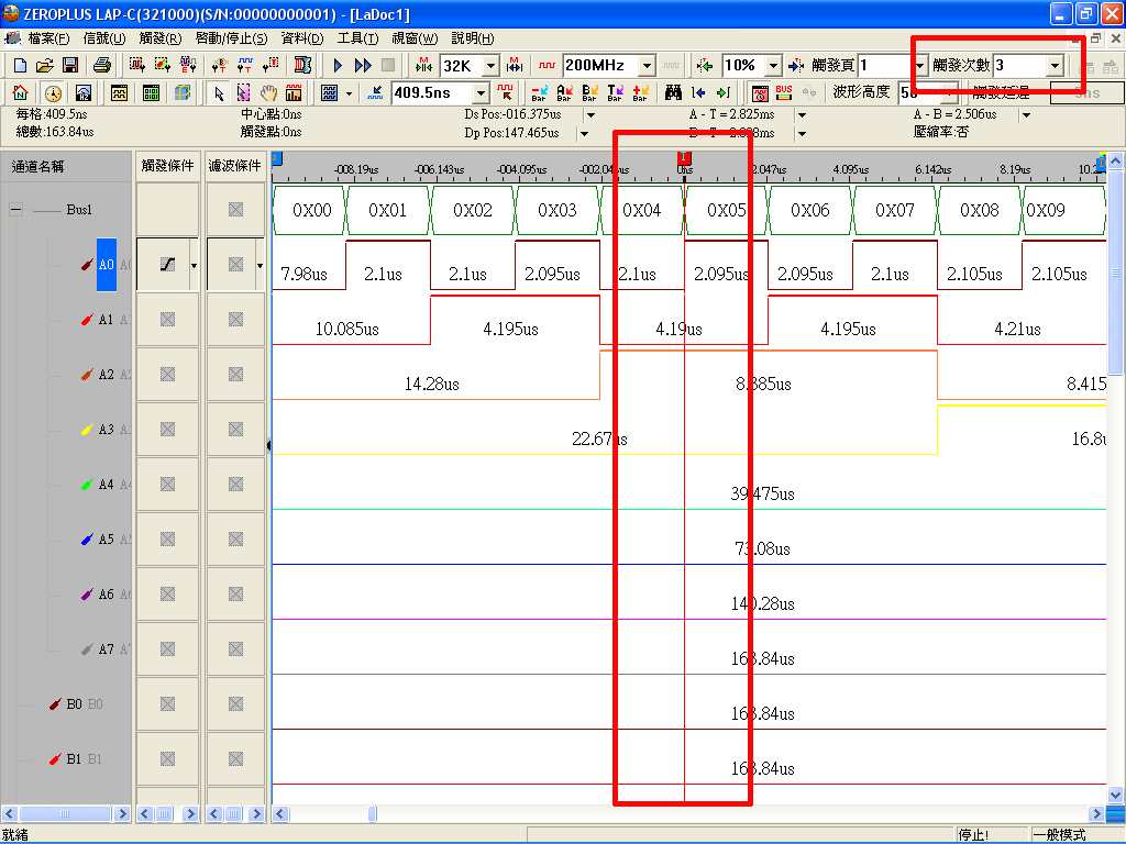 孕龙逻辑分析仪加入了触发次数计算(Trigger Counter)的技术,Trigger Counter,的功能是将有一个以上符合触发值的被测信号,使用者可决定触发点是要在第几个符合触发设定的位置进行触发,*次碰到触发的设定状态时就触发Trigger Counter就要设定为1(预设),第三次碰到触发的设定状态时才触发Trigger Counter就要设定为3,依此类推。 Trigger Counter大可设至65535次。 |
