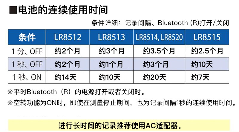 连续使用时间约2.5个月(记录间隔1分钟,Bluetooth® OFF)