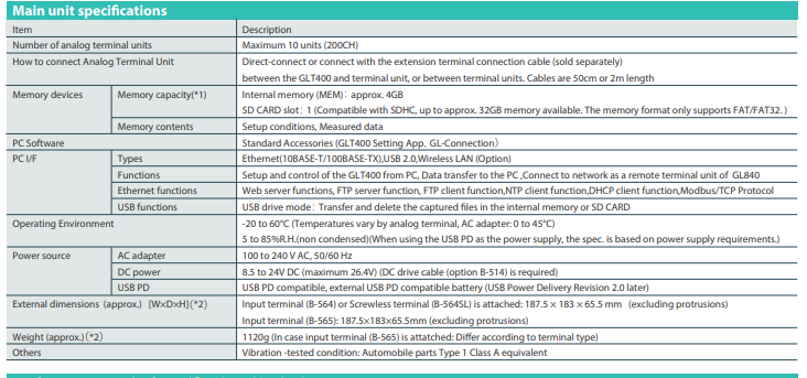 GLT400 无线数据记录仪多可扩展至200ch,可以增加传感器进行电压/温度/湿度/脉冲/逻辑的多元输入。GLT400 记录仪适用于通道数多的温度测定;而耐高电压型GLT400 记录仪适用于积层电池包的电压测定和高精度的温度测定。