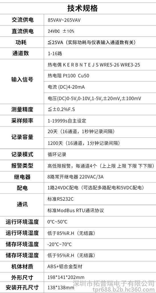 TP710配免费物联网平台实现IE远程监控,手机查看数据,微信报警功能,采用标准MODBUS通讯协议。支持温度、湿度、电流、电压、压力、液位、流量、位移等同时测试,、液晶显示、U盘保存的仪表。