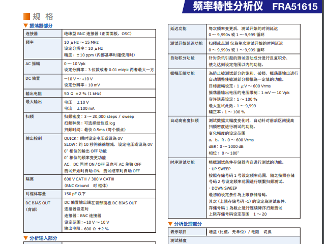 FRA51615频率特性分析仪在被测定物上施加正弦波信号,求出其频率响应特性的装置,因为测量的动态量程非常宽阔,所以不但能够进行高精度的测量,而且具有可以测量超低频率等特长。