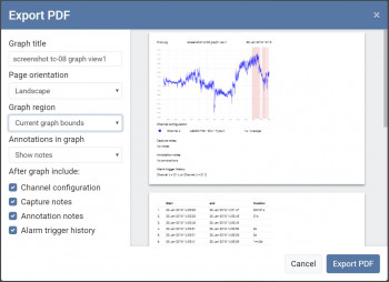 想要导出屏幕截图?PicoLog 6 包含将图形导出为 PDF 的功能:再次选择整个捕获或缩放的感兴趣区域。导出为 PDF 格式还包括选项,包括警报触发历史、注释、通道配置和捕获注释,以获得完整的捕获报告。