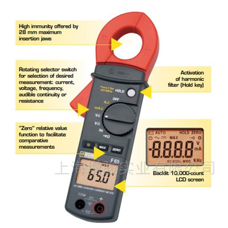 真有效值泄漏电流测量万用钳表是专门用于测量接地线的泄漏电流,您可以选择60mA或是600mA 档量程进行测量。特殊的钳形结构以及抗干扰设计让测试探棒可达到更高的灵敏度(10µA 以及 100µA)。在测试小电流时,隔绝外界噪音也是相当重要的,它能让您的测量更准确可靠。F65 万用钳表可以测量100A RMS、AC/DC电压、电阻及导通性(带有蜂鸣器)F65符合人体工学的设计让您能方便地使用单手操作,钳口直径大小为28mm,是按普遍的接地线大小所设计的。